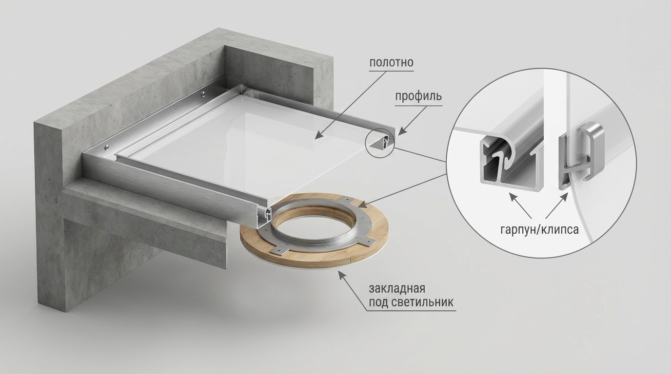 Натяжной потолок — это не только полотно. Система включает багеты, гарпун, закладные и мелкую фурнитуру, от которых зависит геометрия, жёсткость и срок службы конструкции.
