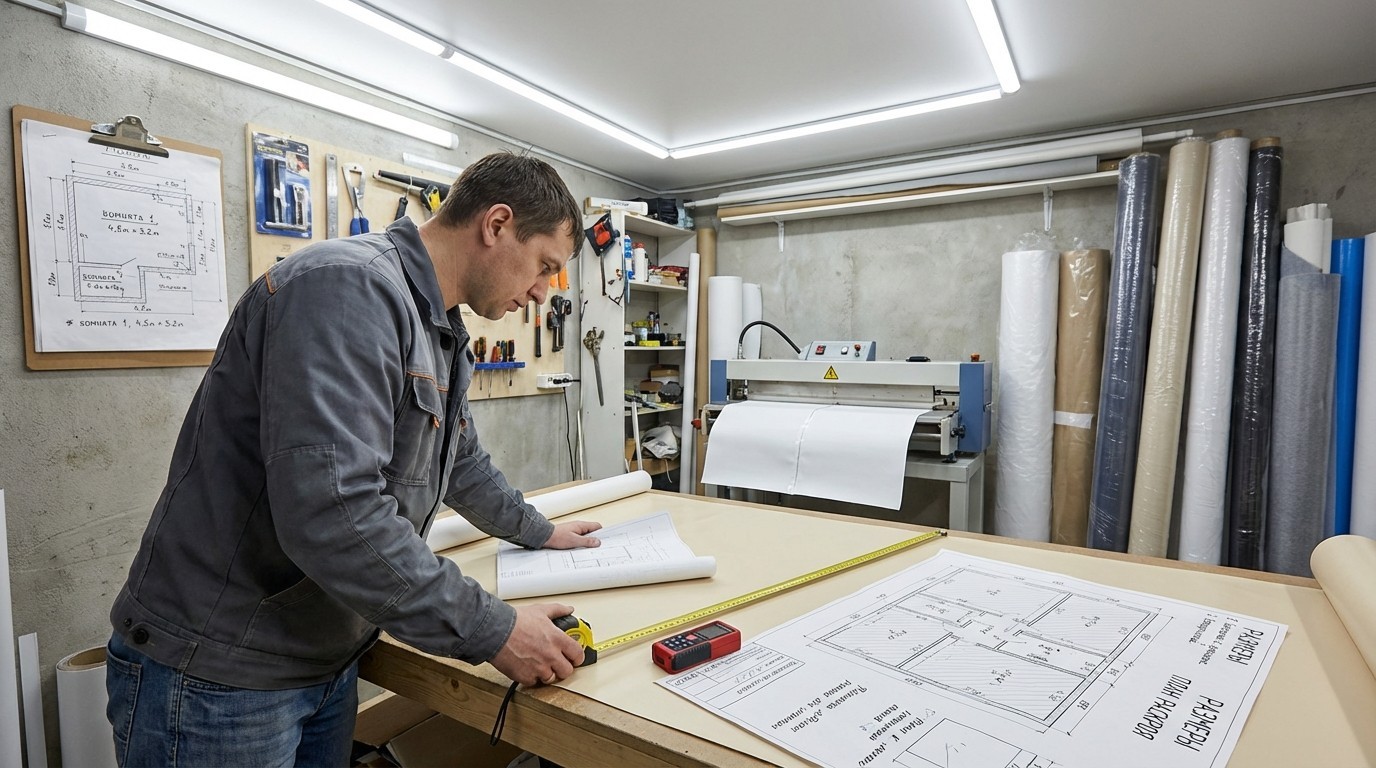 На основе замера технолог строит чертёж и карту раскроя: выбирает направление полотна, расположение швов, учитывает ширину рулона и тип профиля.