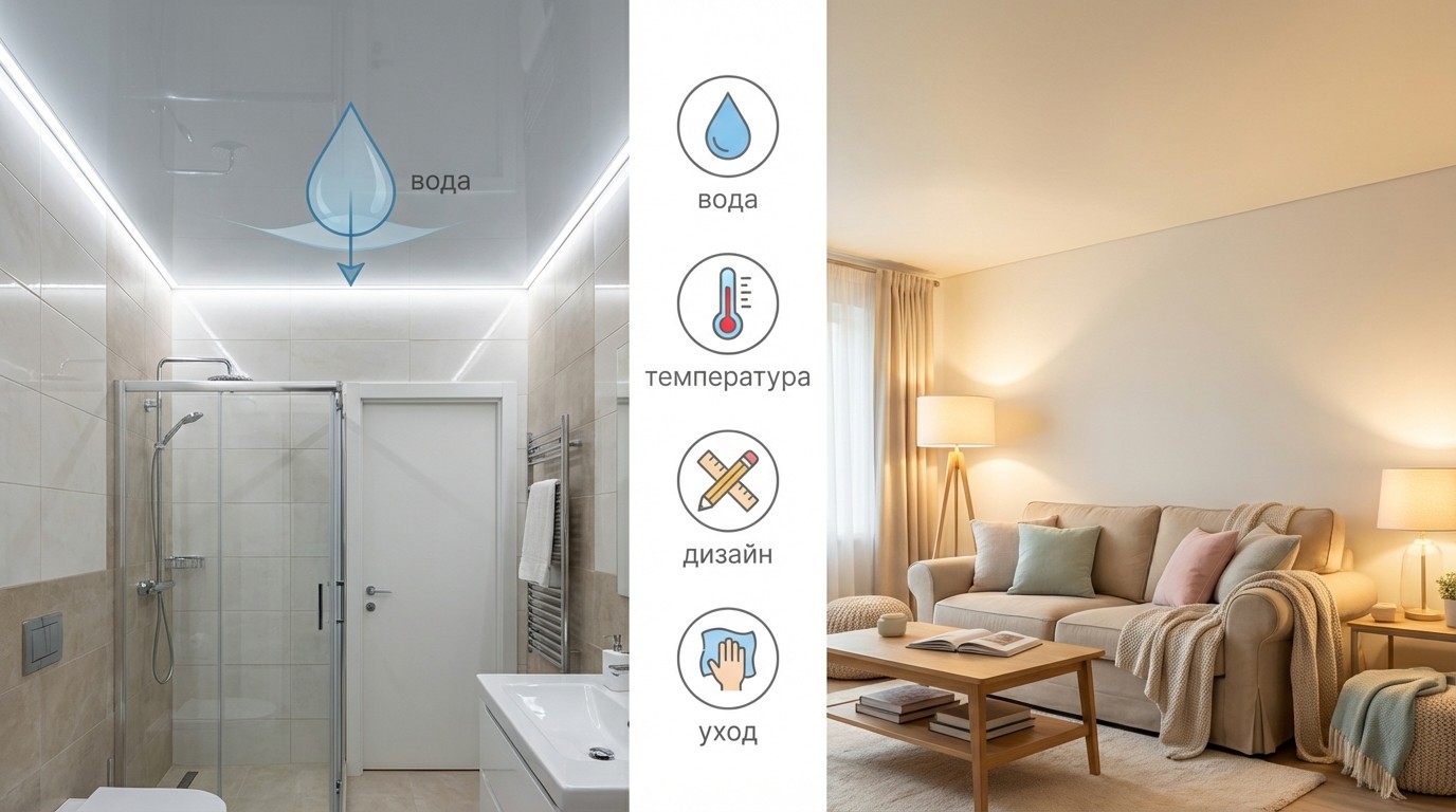 Материал потолка влияет на поведение при затоплении, внешний вид, срок службы и требования к эксплуатации. ПВХ и ткань решают разные задачи, поэтому выбор лучше привязать к условиям в помещении, а не только к цене.