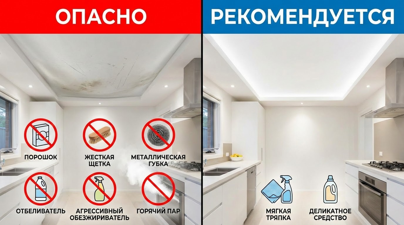 Кипяток и очень горячий пар опасны для ПВХ: материал деформируется, провисает и теряет натяжение. Ошибка также лить средство прямо на потолок — капли стекают, оставляют полосы и попадают в стык между полотном и стеной.