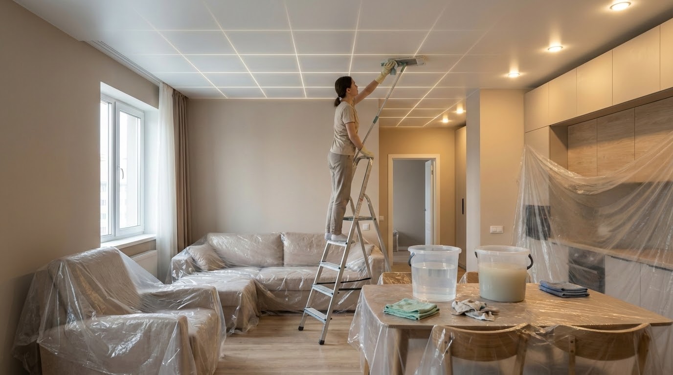 Самостоятельная чистка уместна при свежих следах пыли, паутине, небольших пятнах от еды или насекомых. При сильной желтизне от никотина и кухни, разводах после затопления, старых жировых, ржавых и тёмных пятнах лучше вызвать специалистов: в сложных случаях безопаснее профессиональная химчистка или перекраска потолка.