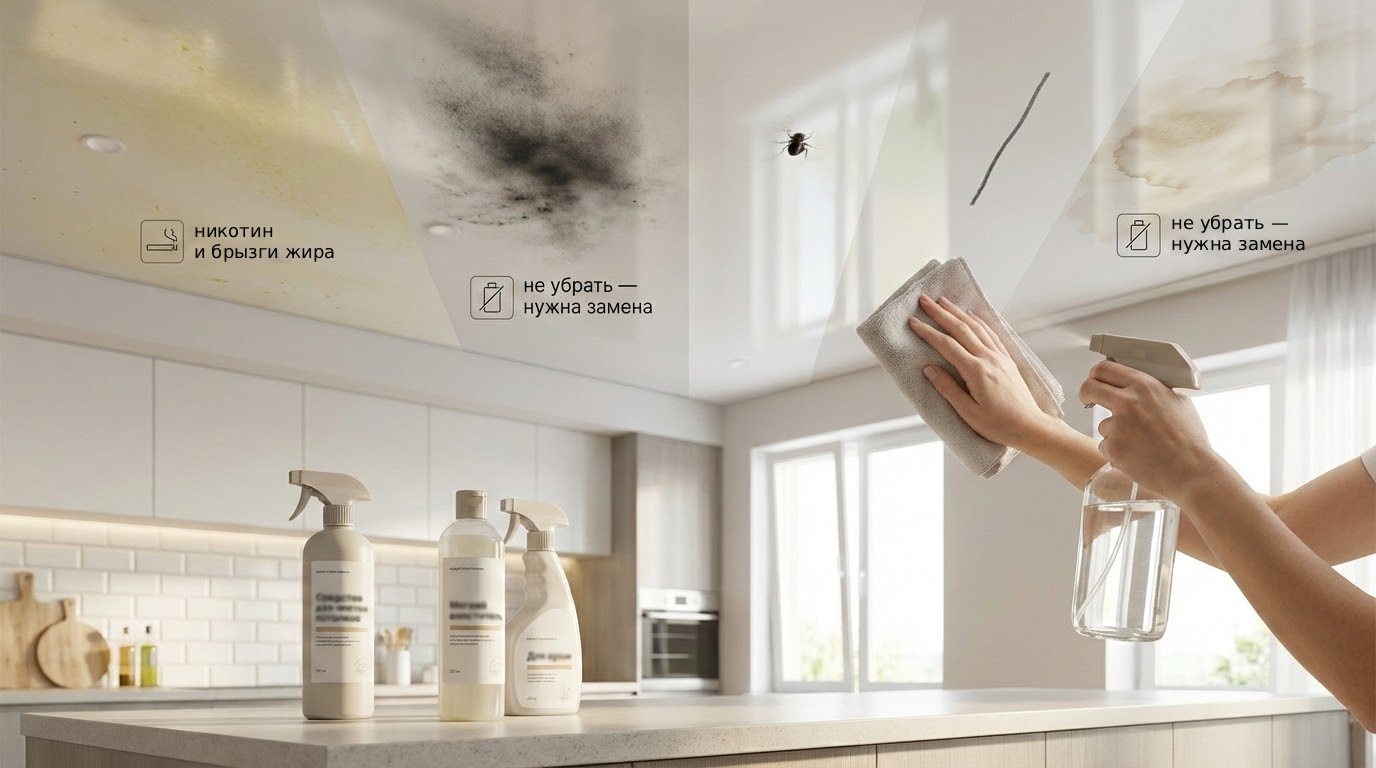 Сложные пятна на натяжном потолке чаще всего появляются из-за жира и копоти на кухне, никотина, насекомых, детских рисунков и протечек. Для ПВХ допустима аккуратная влажная чистка, для ткани — только щадящая точечная обработка, иначе останутся ореолы и деформация.