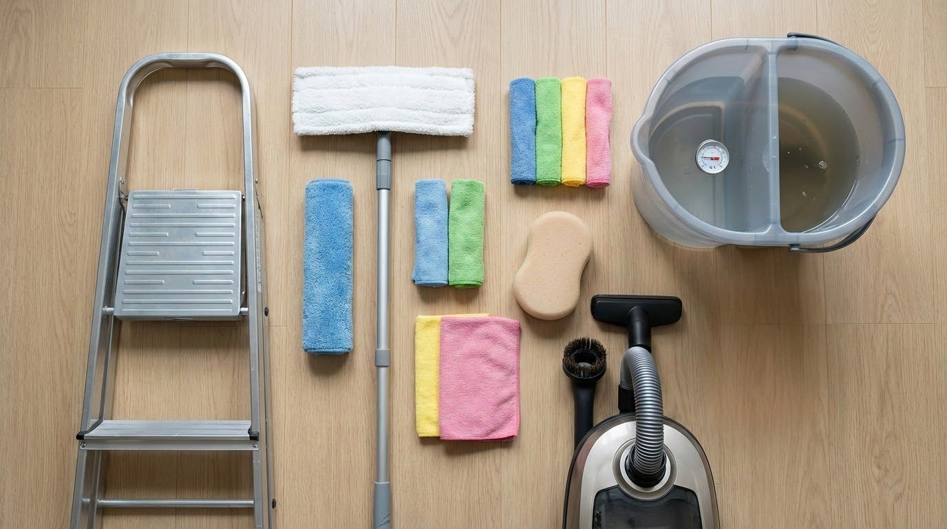 Базовый набор инструментов: устойчивая стремянка, телескопическая швабра или штанга, несколько мягких салфеток из микрофибры, мягкая губка без абразива, ведро с двумя отделениями или двумя ёмкостями для чистой и грязной воды, пылесос с насадкой-щёткой на минимальной мощности.