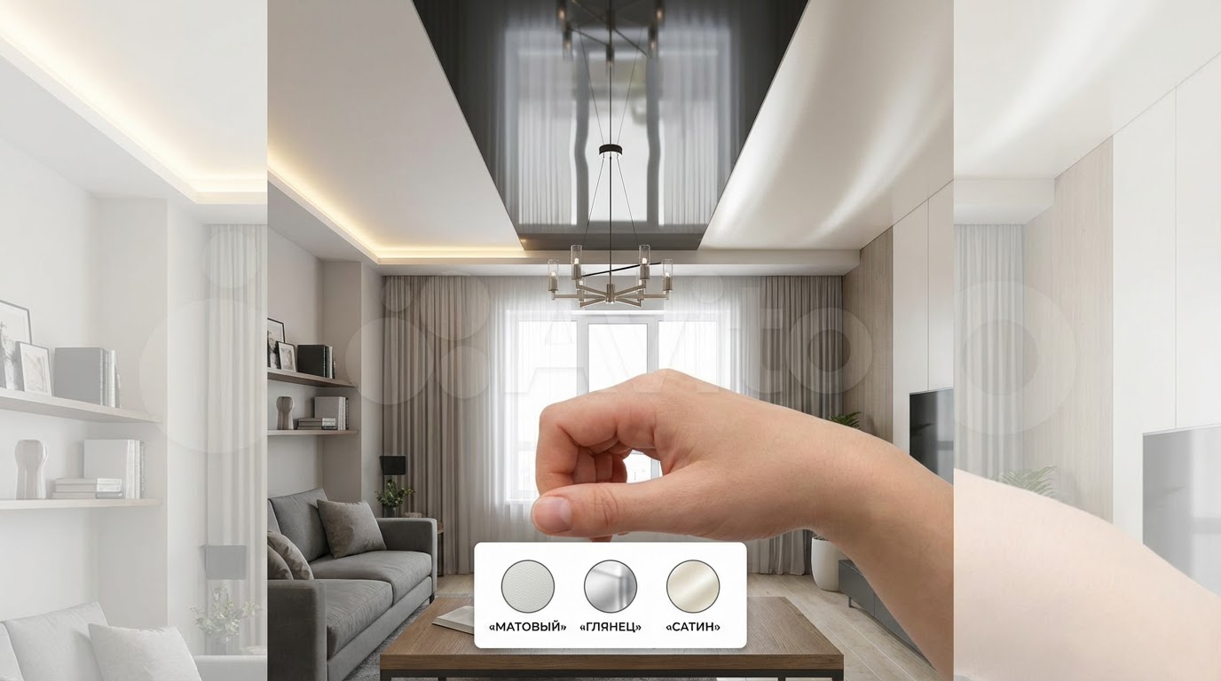 Фактура видна по тому, как поверхность отражает свет. Матовый потолок рассеянный, без бликов и «зайчиков». Глянец даёт чёткое зеркало, отражает окна и люстру. Сатин выглядит как мягкий перламутр: блики есть, но размытые.