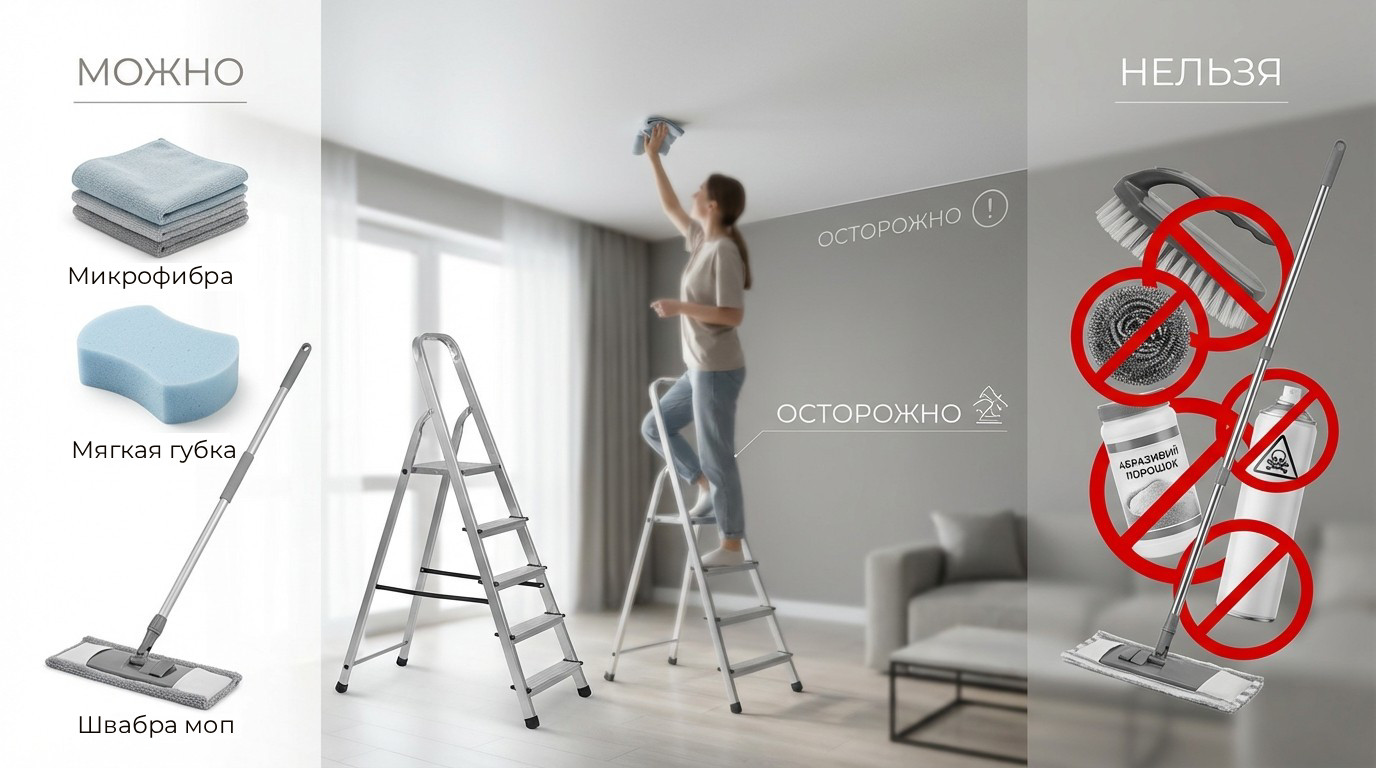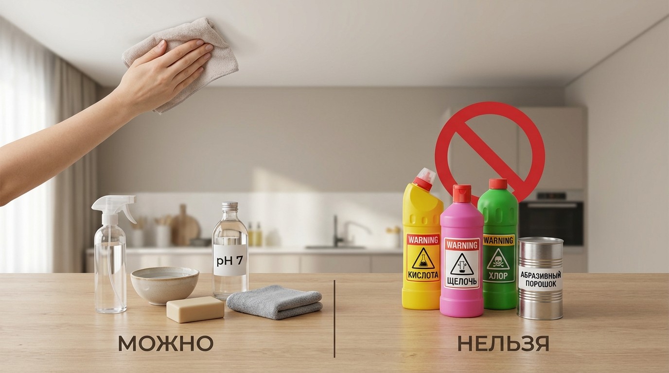 Абразивы царапают поверхность. Запрещены порошки, жёсткие губки, металлические щётки, скребки и меламиновая губка без опыта. Они снимают верхний слой, оставляют матовые пятна на глянце и «затёртые» участки даже на матовых потолках.
