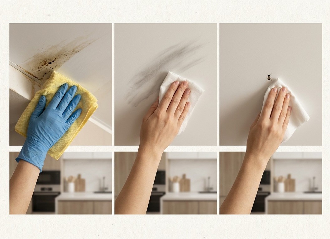 Даже в чистой квартире потолок собирает микропыль, а на кухне к ней добавляются жир и копоть. В ванной на плёнке оседают конденсат и известь, в жилых комнатах — табачный дым, следы насекомых, иногда брызги напитков или детские «рисунки».