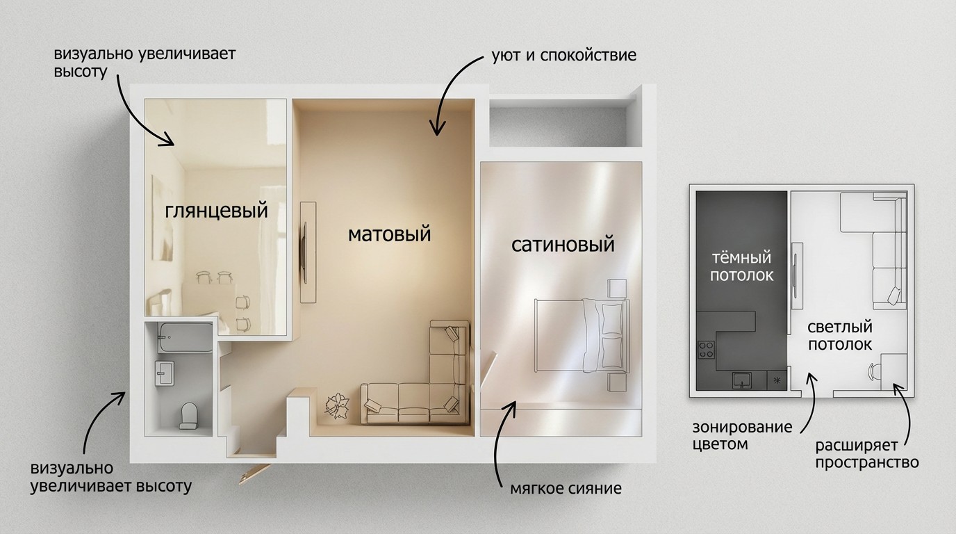 При выборе учитывают тип полотна, форму и размер комнаты, высоту, бюджет и планы на возможный демонтаж. Для себя стоит уточнить у замерщика: