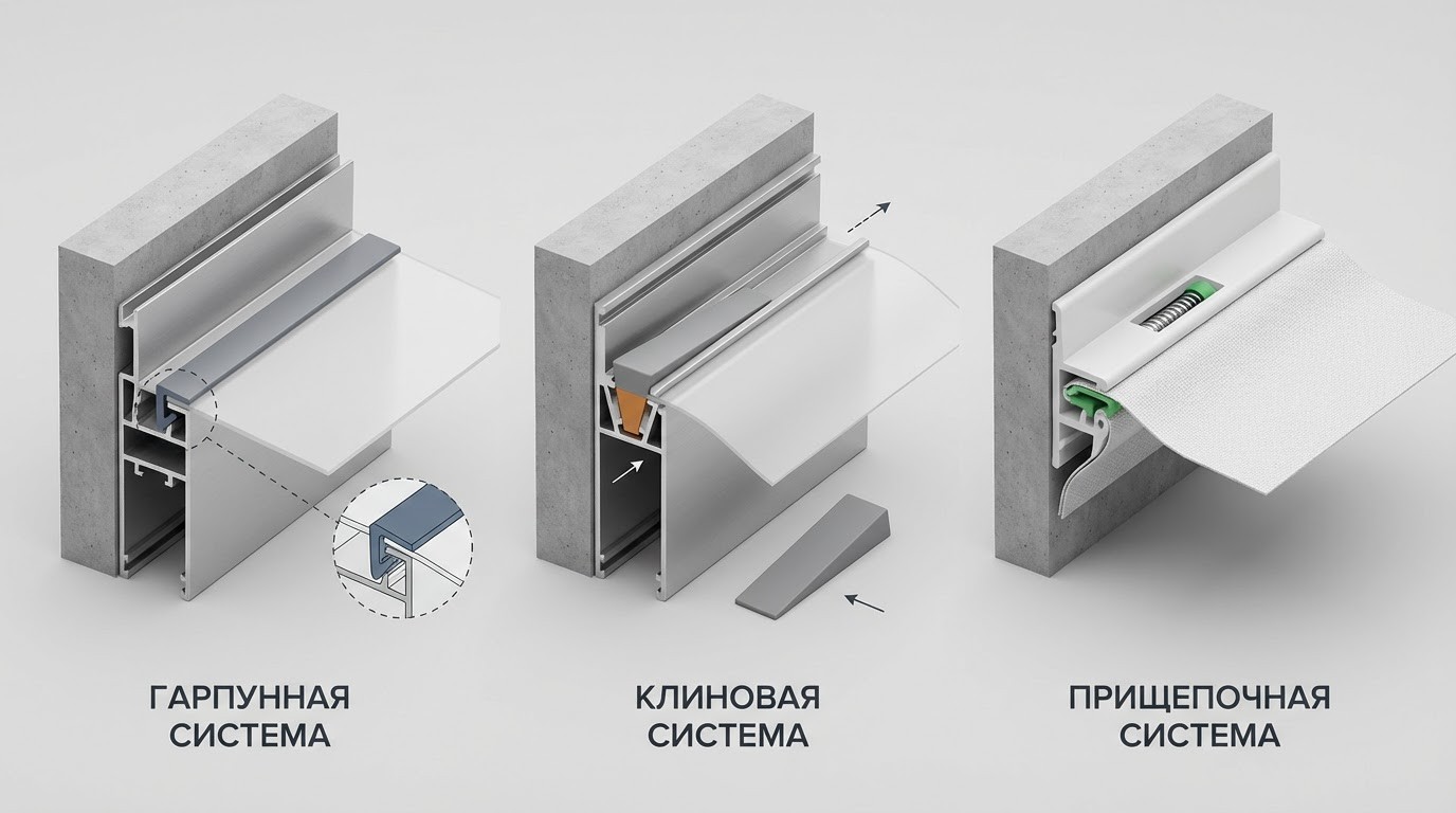 Полотно держится за счёт зацепления к багету, который крепят по периметру стен или коробов. Существуют три базовые системы: гарпунная, клиновая (штапиковая) и прищепочная (клипсовая). Французские профили — разновидность гарпунной системы с более жёстким замком и аккуратным примыканием к стене, голландские — вариант клиновой с другим пазом и возможностью подрезки по месту, кулачковые — модификация прищепочного крепления с подпружиненной защёлкой, которая поджимает полотно при натяжении и облегчает демонтаж небольших участков.