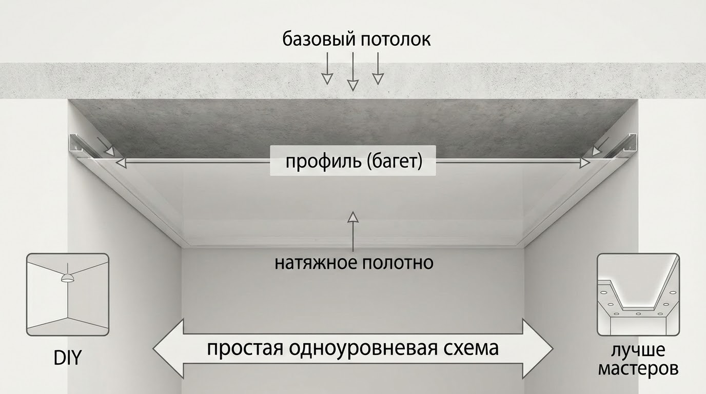 Для новичка важны простая геометрия, предсказуемое поведение материала и возможность исправить ошибку. Под эти критерии лучше всего подходит одноуровневый потолок в прямоугольной комнате с 1–4 светильниками и без ниш под шторы.