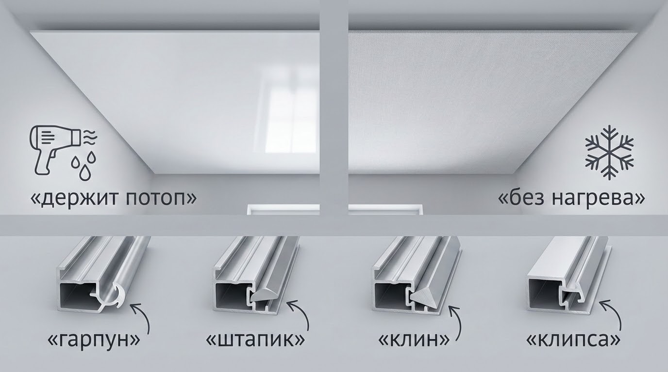 Системы крепления различаются по сложности и ремонтопригодности. Гарпунная позволяет демонтировать и перетянуть полотно, но требует точных заводских замеров. Штапиковая и клиновая допускают подрезку по месту, зато повторный демонтаж затруднён. Клипсовая чаще идёт с тканью и удобна в работе, но почти не прощает ошибок по размеру.