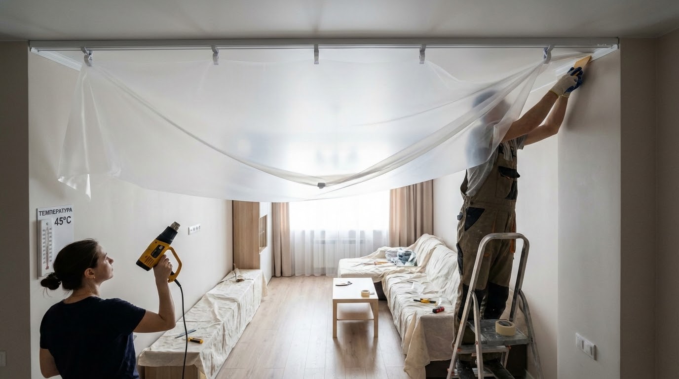 Натяжной потолок держится на жёстком профиле по периметру. В него заправляют ПВХ‑полотно или ткань, которые при нагреве или механической натяжке выпрямляются и образуют ровную плоскость. Ошибки на этапе разметки, крепления багета и работы с полотном приводят к провисанию, складкам и порезам.