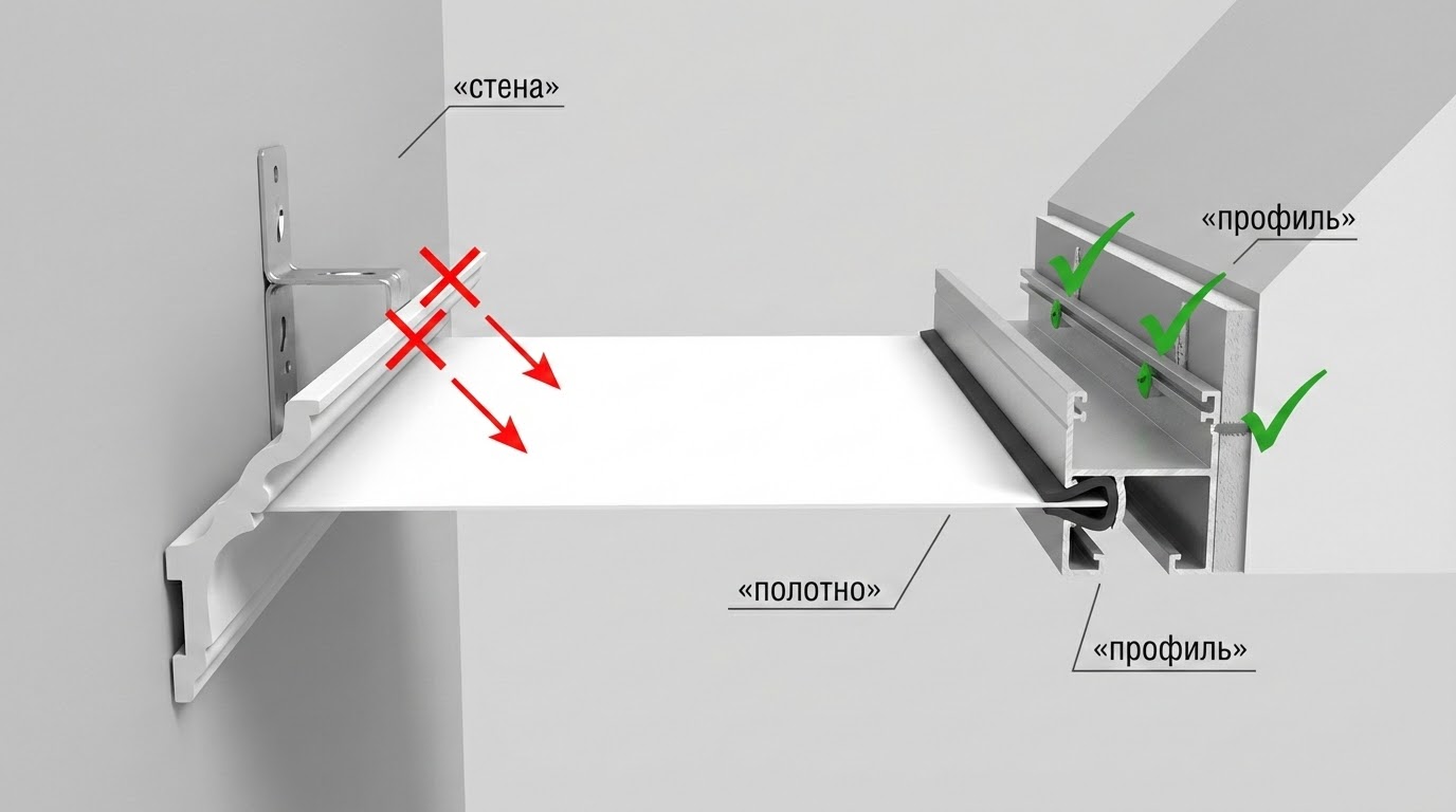 Оба решения монтируют только к стенам или закладным, оставляя стабильный зазор до натяжного потолка. Ошибки — крепление к слабой штукатурке, отсутствие закладных под тяжёлый профиль, прижим плинтуса к плёнке и прокладка проводов вплотную к полотну: это повышает риск перегрева, трещин и потери гарантии.