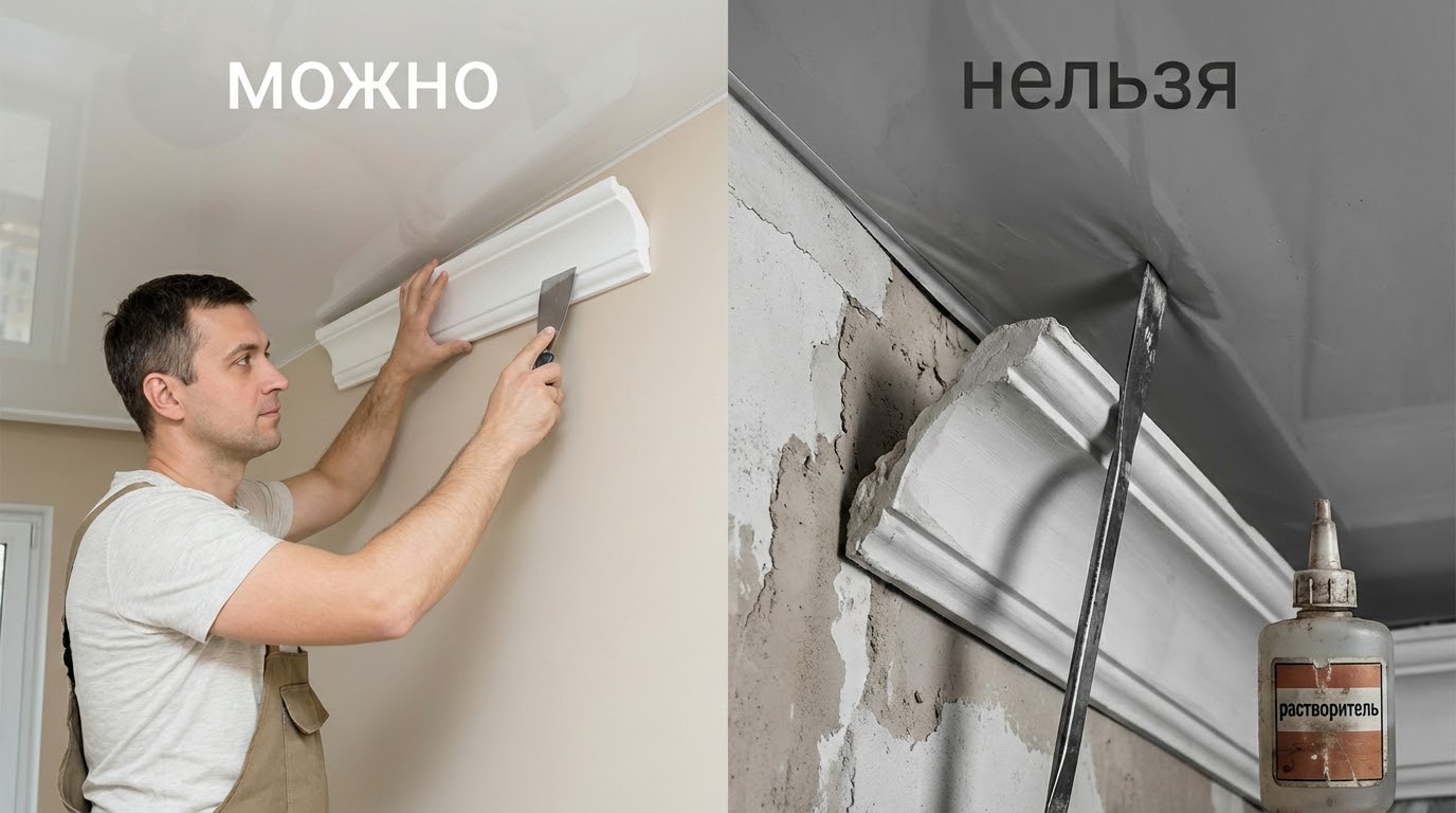 Полотно натяжного потолка тонкое и постоянно находится в натяге. Любая точечная нагрузка, клей с растворителем или жёсткий контакт с плинтусом дают риск разрыва, морщин и потери гарантии от установщика.