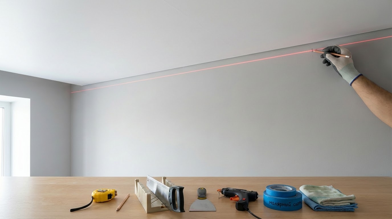 Подготовка включает очистку стены от пыли и слабых слоёв, при необходимости грунтование. Разметку ведут уровнем или лазерным построителем, чтобы линия шла параллельно натяжному потолку и не касалась его. Для работы нужны рулетка, карандаш, стусло, ножовка или нож, шпатель, пистолет для клея, малярный скотч и чистые тряпки для удаления излишков.