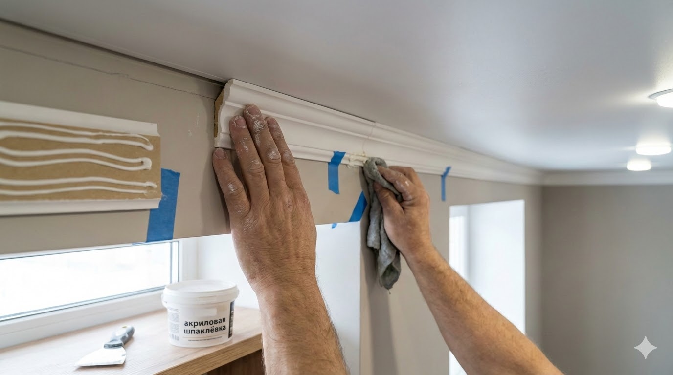 Монтаж ведут по участкам. Клей наносят полосами или точками на тыльную сторону, распределяют, прикладывают плинтус по разметке, прижимают к стене, не опираясь на натяжной потолок. Излишки сразу снимают влажной тряпкой, элемент временно фиксируют полосами малярного скотча. После высыхания швы и мелкие щели заполняют акриловой шпаклёвкой, при необходимости слегка шлифуют и красят водоэмульсионной или акриловой краской, закрыв полотно защитной лентой и плёнкой.