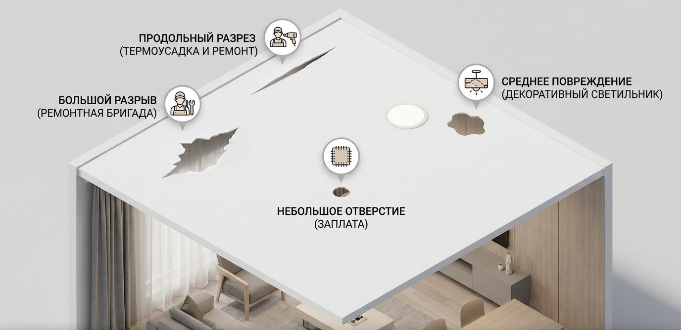 Повреждения у стены, шва, гардин и светильников относят к зоне повышенного риска. Здесь чаще требуется подтяжка полотна, перекрой кромки и новый гарпун, что обычно делает мастер.