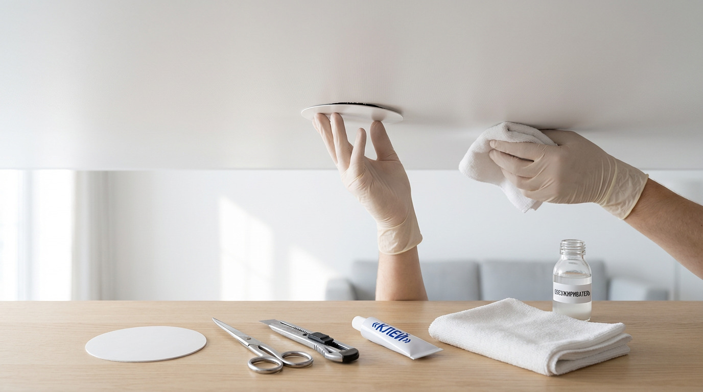 Алгоритм один: разметить центр, наклеить термокольцо на ПВХ, аккуратно вырезать отверстие внутри кольца и установить выбранный элемент по инструкции. Кольцо снимает нагрузку с краёв и защищает от новых трещин.