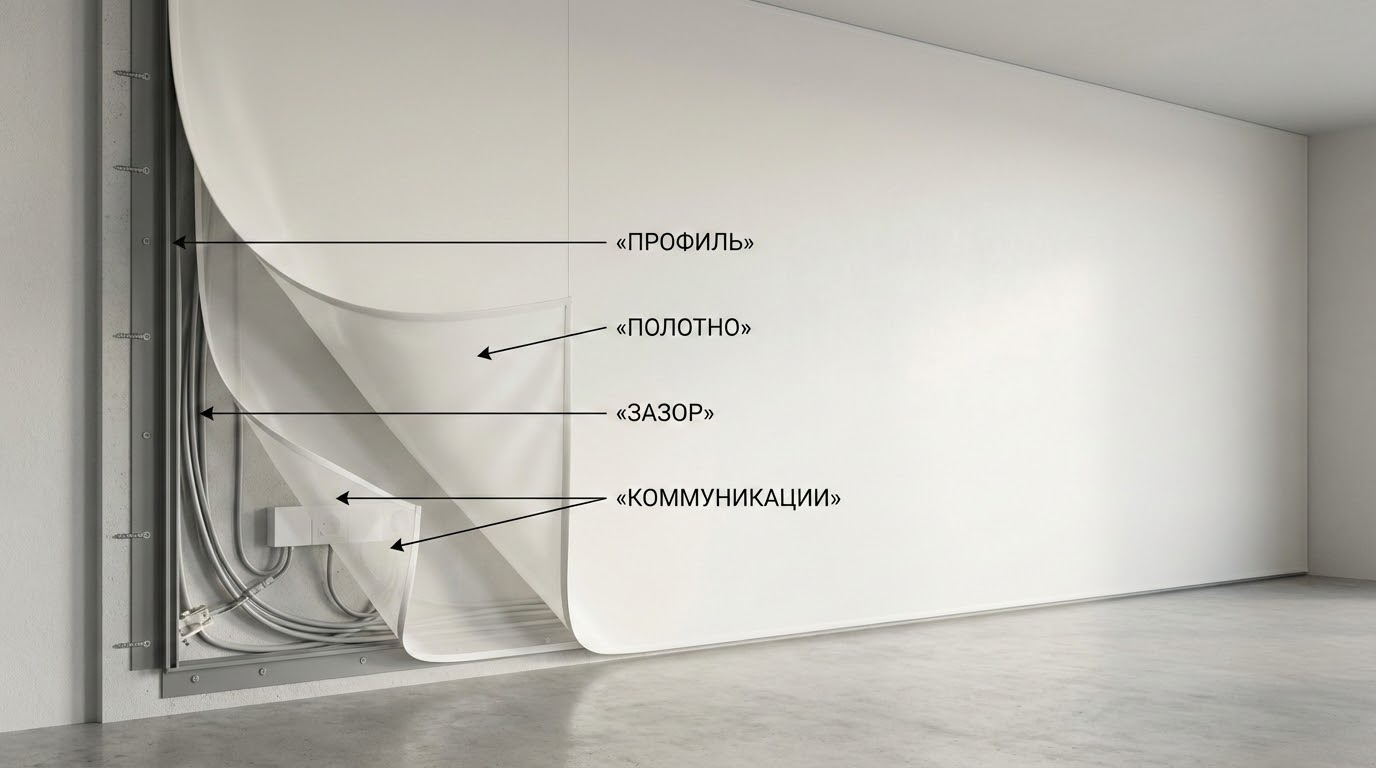 Основа конструкции — жёсткий профиль (алюминий или пластик), закреплённый по контуру. Внутрь защёлкивают или заправляют полотно, между ним и стеной остаётся воздушный зазор. В этом пространстве прячут проводку, кабели, иногда тонкие коммуникации и закладные под розетки.