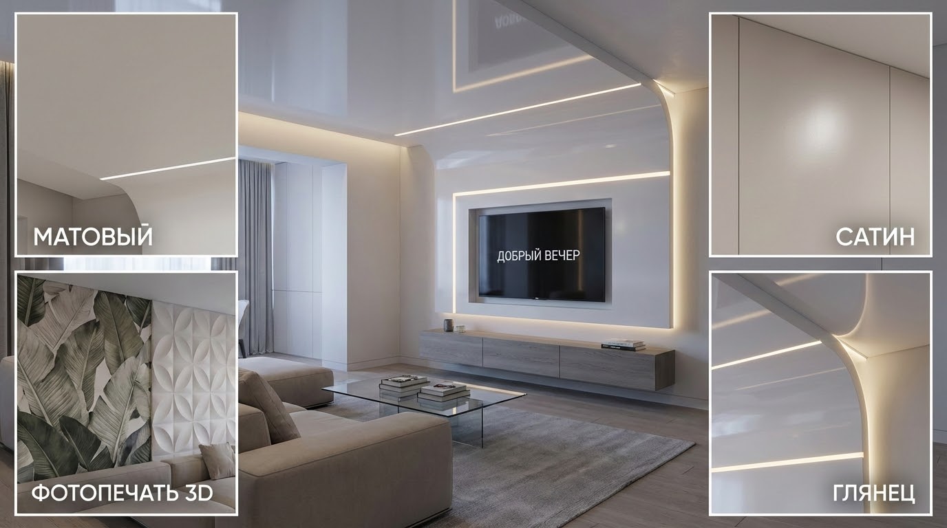 Фактура и дизайн заметно меняют бюджет. Глянец, сатин, полупрозрачные, 3D‑фактуры и фотопечать стоят дороже базового матового полотна. Подсветка, сложные контуры, ниши и переход потолка на стену добавляют профиль, фурнитуру и время монтажа.