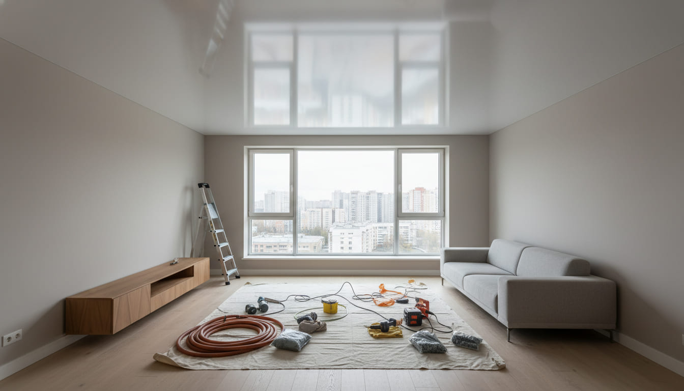 Завершающая стадия ремонта – потолок – требует нескольких часов работы. С ней справляется бригада из 2-3 человек. По периметру комнаты монтируется крепежная система, производится разметка будущего местоположения осветительных приборов, нагретое тепловой пушкой полотно фиксируется на металлическом профиле при помощи зажимов. Предваряет монтаж подготовка, которая предусматривает замеры, выбор материала, дизайн-проект. В сравнении с другими видами оформления, натяжной вариант самый простой и недорогой способ привести помещение в порядок. Служат подвесные потолки десятилетиями, уход за ними минимален.